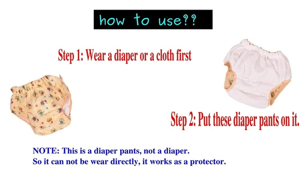 Easy to Use Cloth diapers are designed to make cloth diapering easy for everyday people. Its wide slot opening makes it easy to stuff and remove insert. Slot cover protects your baby from wetness. This product is meant for mild urine and short term use . Do not intend to use these for prolonged hoursWashable Reusable Plastic Diaper PVC plastic diaper pants are reusable and washable. These diapers are high absorbent and will keep your baby fresh for long hours.PantsThese Baby Diaper Pants are made from high quality material. This Baby Diaper Pants helps to keep your baby fresh for long hours. Elastic waistband is flexible and makes them easy to use and also helps to support diapers.Pants are adjustable and flexible.The outer layer is plastic and the inner layer is soft fabric. These baby diaper pants needs to wear on baby diaper, it cannot be wear directly.Easy to Use Cloth diapers are designed to make cloth diapering easy for everyday people. Its wide slot opening makes it easy to stuff and remove insert. Slot cover protects your baby from wetness.