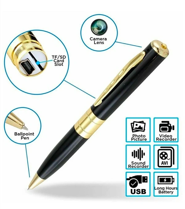 Spy Pen This is a smart advanced video pen. At many important moments, you will miss some important content. This is why we brought this spy pen, We advocate improving people's quality of life and convenience. It can help you record critical moments and beautiful moments. Hidden camera and photo functions can improve the quality of the study, work, and life. Spy Camera Pen Concealment— This is a very common everyday pen, with a recessed camera design and a lens with a sliding lens cover that can be clipped to the pocket of a notebook or shirt. This kind of miniature wearable camera pen is hard to notice when recording, especially when the slide cover is up., it can help you record important information at critical moments. Spy Camera Pen Convenience—Convenient design, access to the content through the memory card, you need to go through an external device, the wireless spy pen allows you to use it anytime, anywhere. Convenient charging design. Charging can be done directly through the data cable. It can be charged by a power bank outdoors, and it can record while charging. It comes with a 32GBSD card to help you access more content. How to play video? 1. Connect to the computer via USB cable, and then use the player to play the video. 2. Remove the SD card, use a card reader to connect to the computer, and then play the video. How to charge a Spy Camera? Connect to the USB port on the computer or use a 5V power supply. Instructions for use Video mode: Press the top function button until the blue indicator turns on, the pen camera will start video-taking after the blue light flashes 3 times. The light would be off when the video-taking is going on. Press the function button 1 more time, video taking ends, the blue light would be back again ( stand by mode ). If you press the function button 1 more time, the pen camera will start